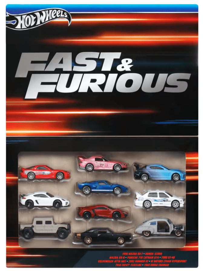 Includes 10 Fast & Furious-themed Hot Wheels Vehicles in 1:64 Scale.