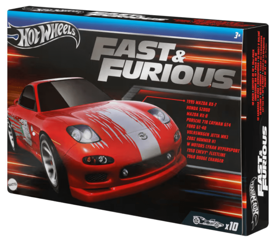 The Hot Wheels Fast & Furious themed 10-pack delivers a variety of rad replicas inspired by and seen in the high-speed film franchise. Each 1:64 scale die-cast vehicle features elevated deco execution to appeal to fans and Hot Wheels collectors alike. The set includes replicas of iconic Fast cars such as the Porsche 718 Cayman GT4, Honda S2000, Ford GT-40, ’68 Dodge Charger and the ’95 Mazda RX-7. Colors and decorations may vary.