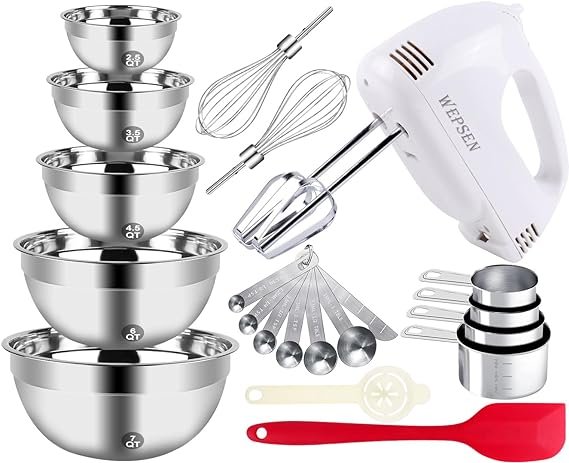 - ①Super Mixer with Bowls Baking Set: This is a versatile combination, a great kitchen gadget for baking, cooking, serving, mixing and preparation. This kitchen essentials set include a handheld electric mixer with 4 attachments(balloon whisks, beaters), 5 nesting mixing bowl, 4 stainless steel measuring cups, 7 steel measuring spoons and other baking tools. All of stainless steel attachments are dishwasher and fridge safe.