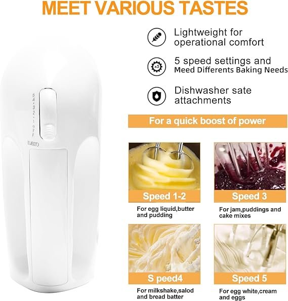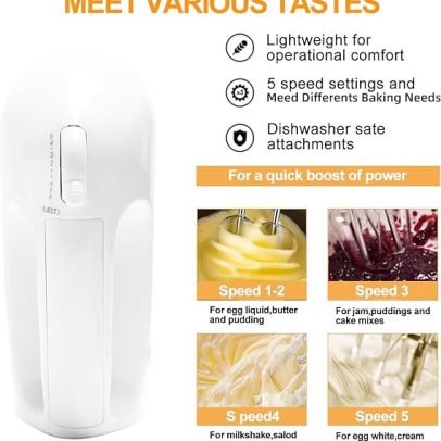 - ②Electric Hand Mixer: With 200 Watt powerful motor and 5 multiple speed hand mixer will meet most of your mixing needs. Slower start and then increase speed for optimal mixing consistency and to prevent messes. All settings are thumb-operated, which means the hand mixer is very easy to use.