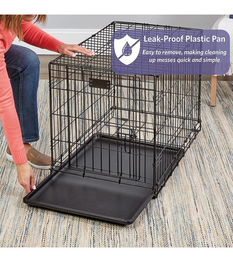 Dog crate includes a divider panel, durable & leak-proof plastic pan, protective rubber feet, carrying handle, and customer support team based in Indiana
