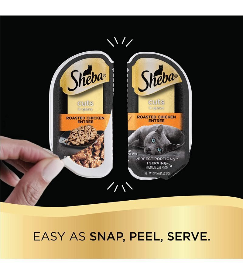Contains twenty-four (24) 2.6 ounce twin pack trays (48 servings total) of Sheba wet cat food cuts in gravy perfect portions variety pack: (12) roasted chicken entree, (6) gourmet salmon entree, (6) tender turkey entree