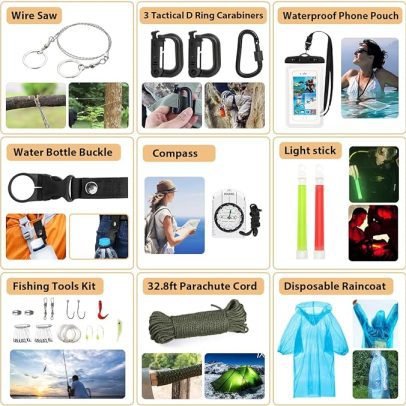 【250 in 1 Survival Kit】Owning an emergency kit is an important step to prepare for unexpected events. This emergency survival kit is specially designed and curated by 3 survival experts, including a total of 250 multi-functional survival tools. It contains the most popular survival gear and tools, as well as a first aid kit, which is enough to treat family or friend groups in an emergency.
